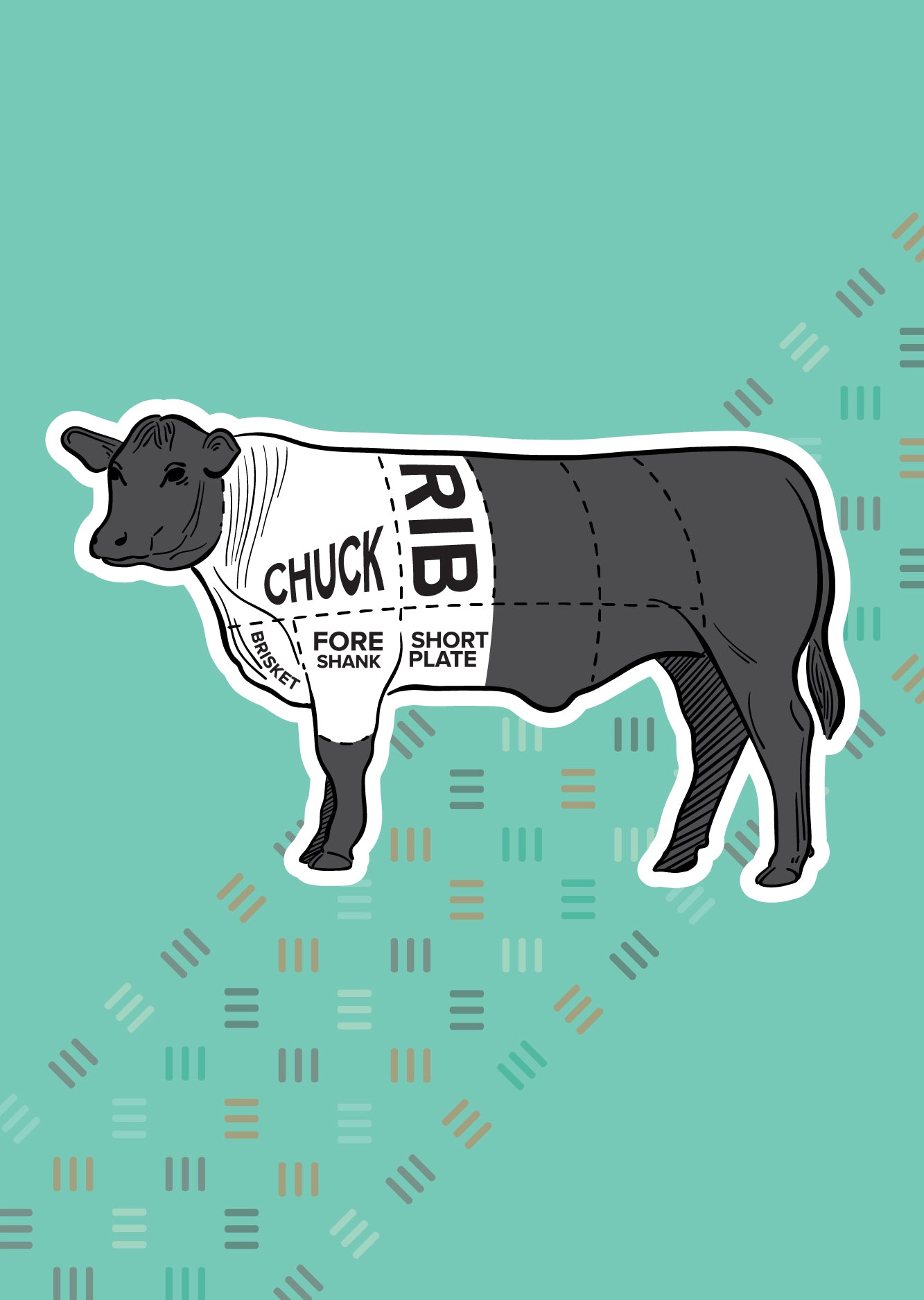 The front quarter of a beef side is separated from the hindquarter at the 12th and 13th ribs. The front quarter consists of the rib, chuck, shank, brisket, and plate. The rib features cuts like prime rib and short ribs, while the chuck includes sections such as the blade, flat iron, neck, cross rib, and chuck short ribs and of course, ground beef.