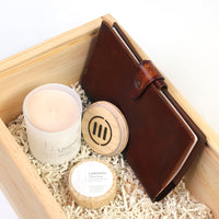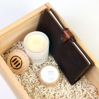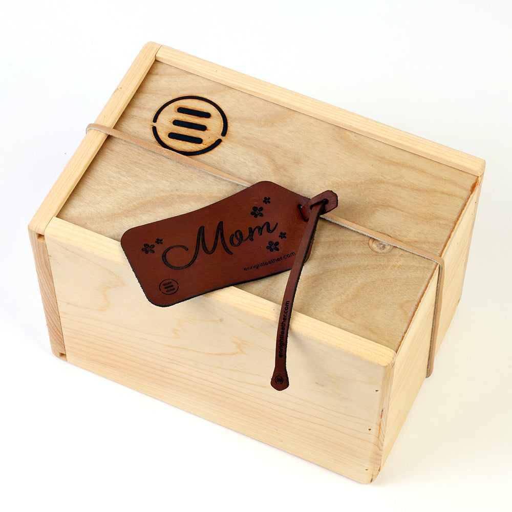 All of this is packed in a custom pine box, fire-branded with our farm logo. It’s tied closed with a thin strip of our leather — like a rustic ribbon — and finished with a leather tag engraved simply with “Mom.”