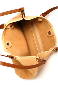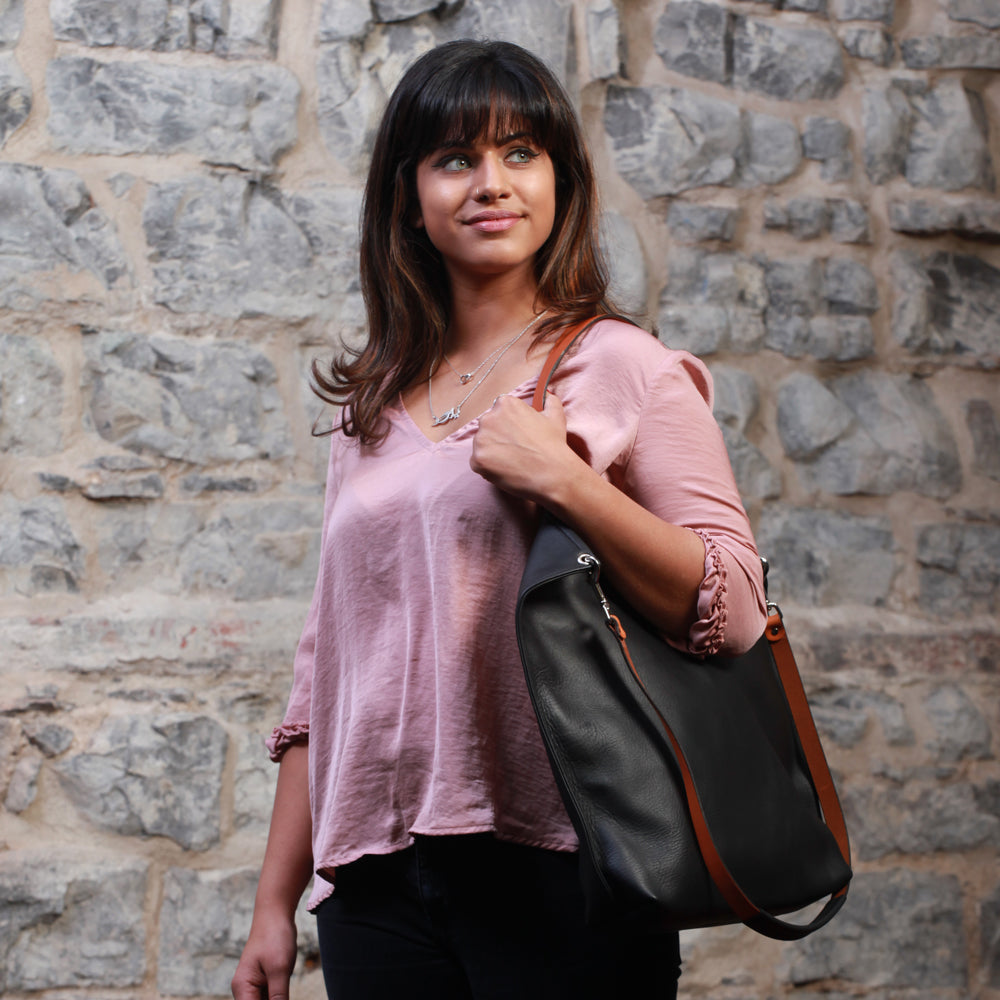 Boasting stainless steel harness-grade hardware, this tote-style bag features two big patch pockets on the outside and a zippered one inside that’s perfect for keys, change or gloss. Comes with a hand grip and shoulder straps.