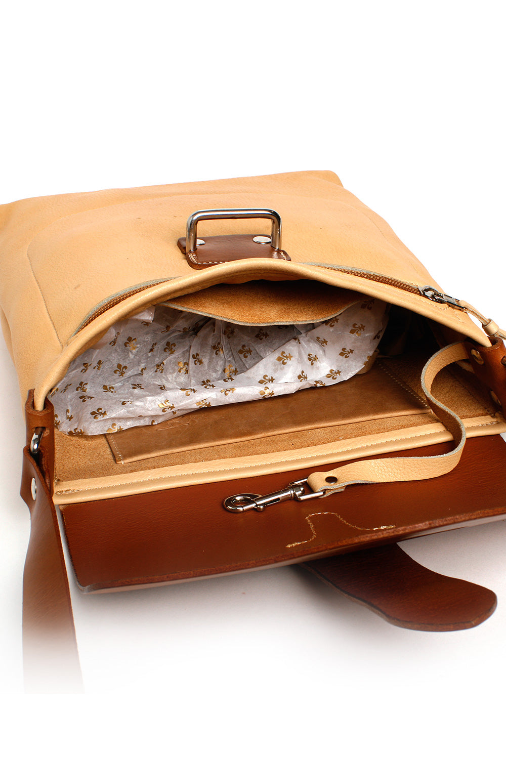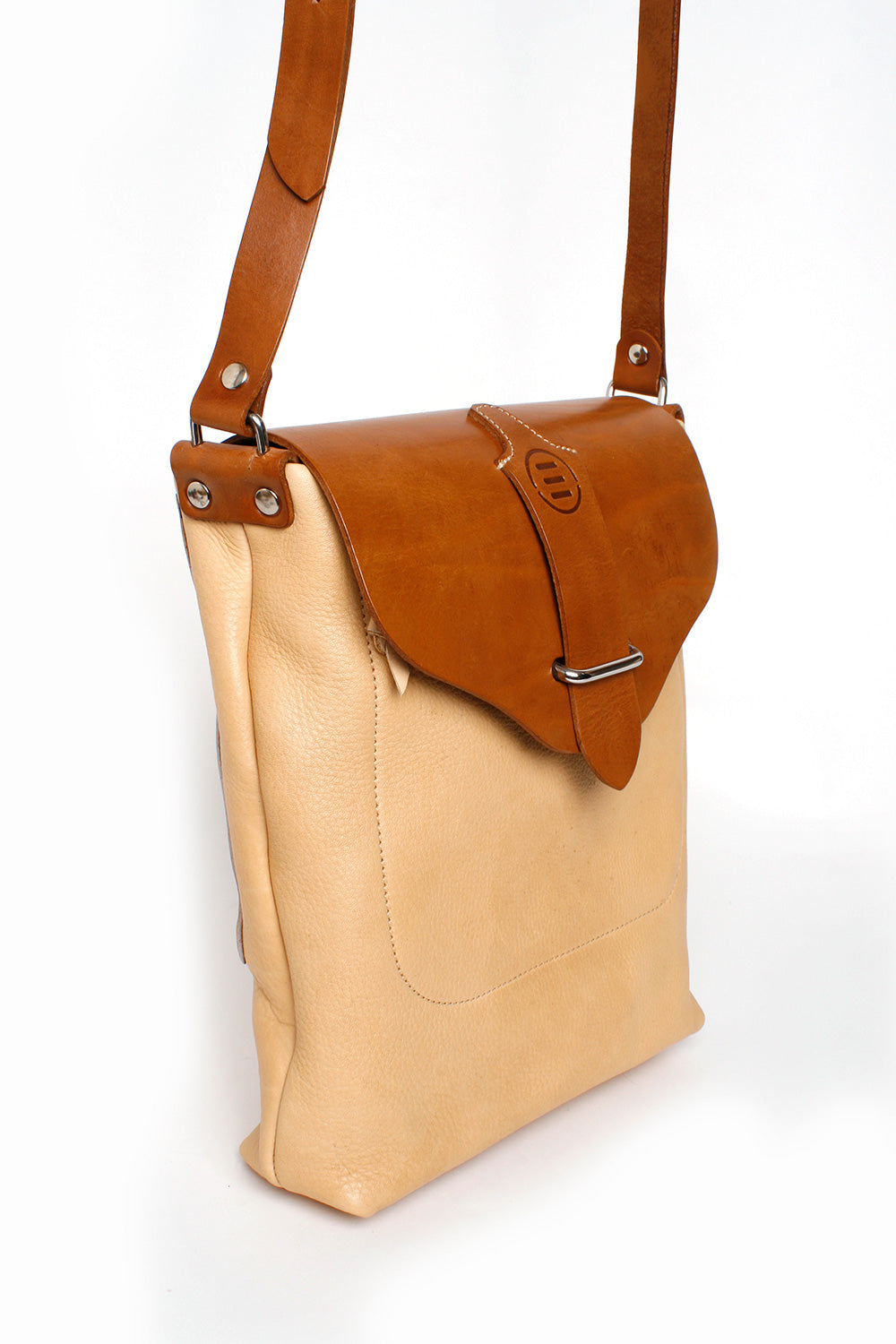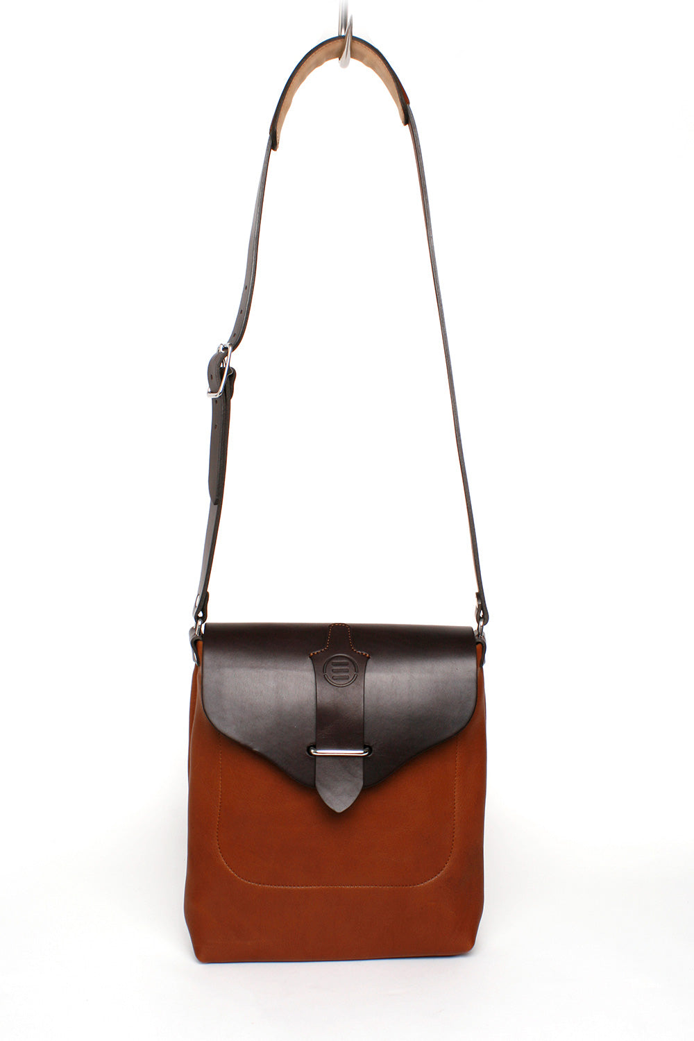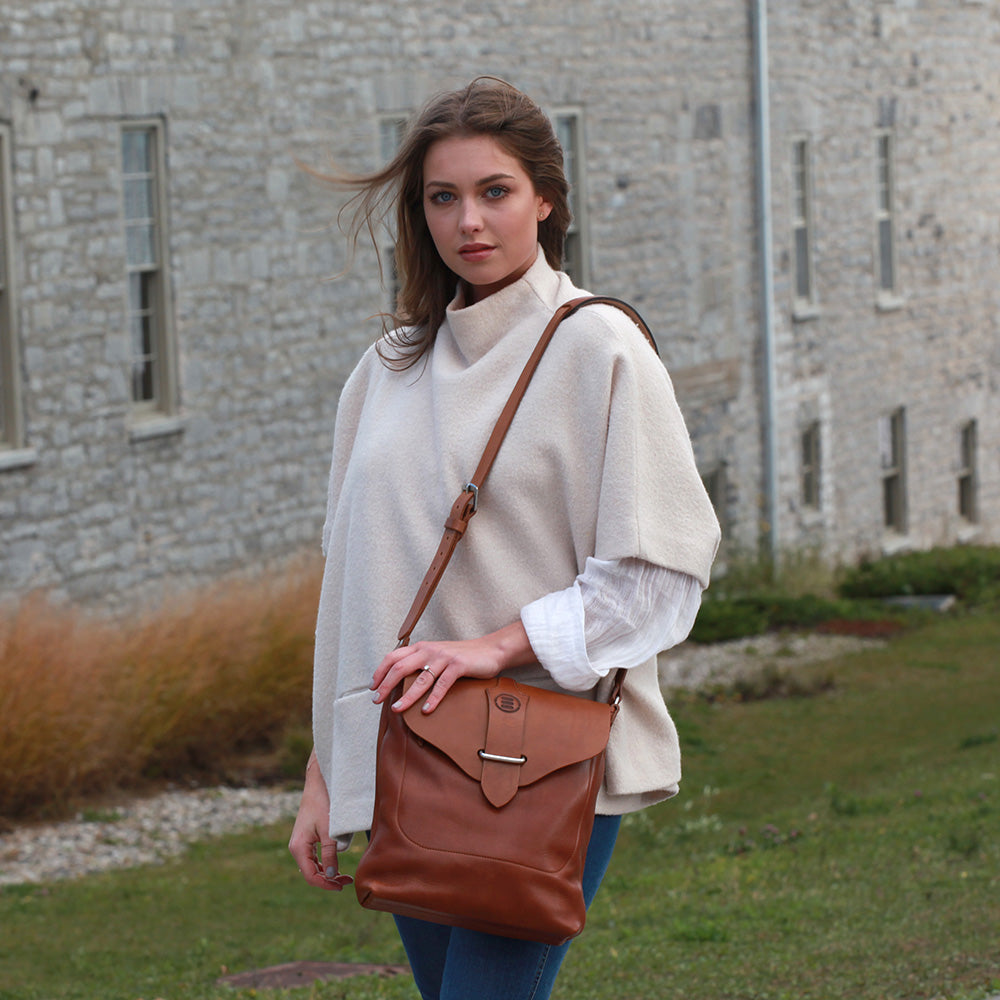 The Bella shoulder bag has several interior pockets and one large zippered external pocket on the front and a patch pocket on the back. It features an easy to use closure. All hardware is cast stainless steel harness grade. It has a reinforced bottom. Adjustable strap.